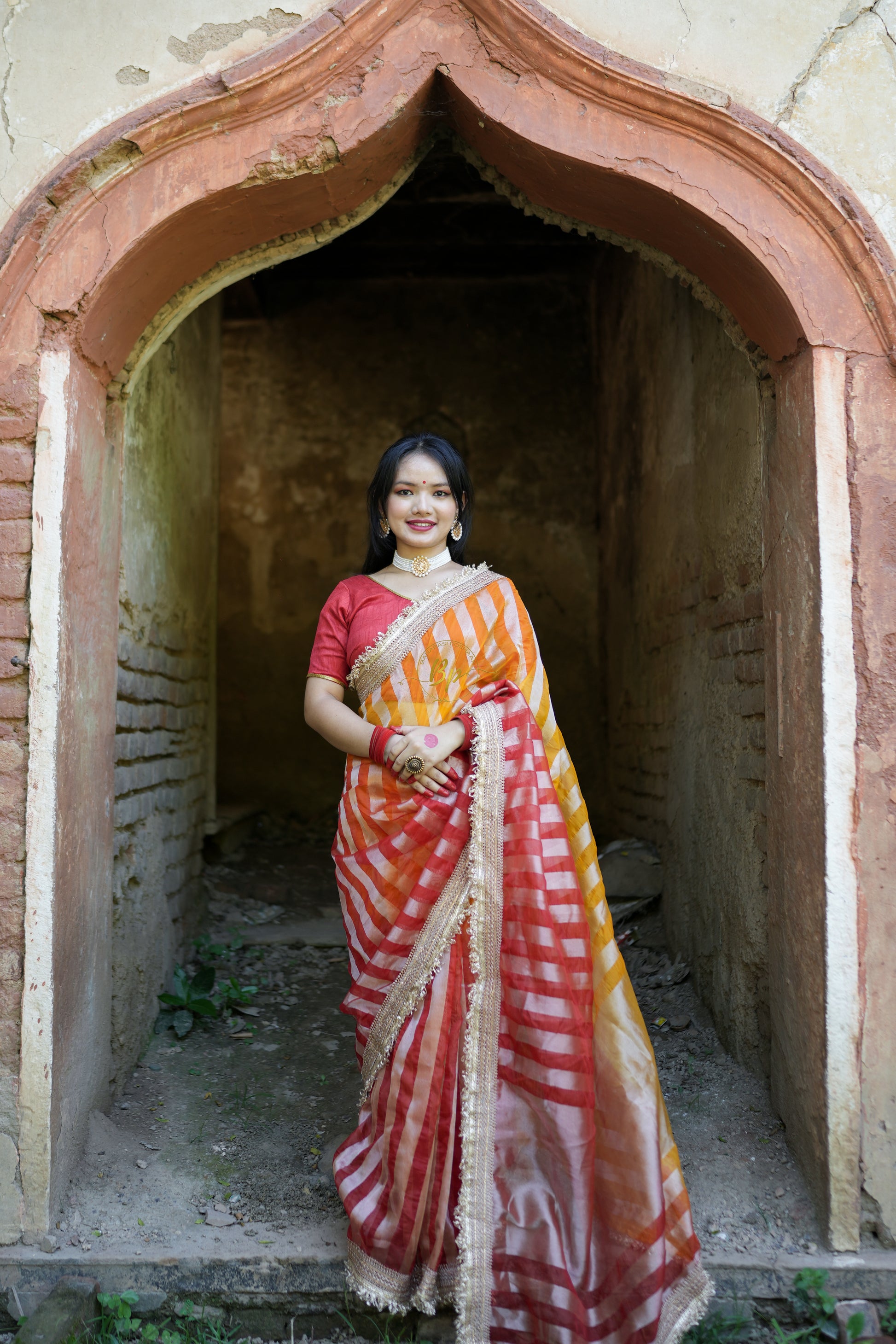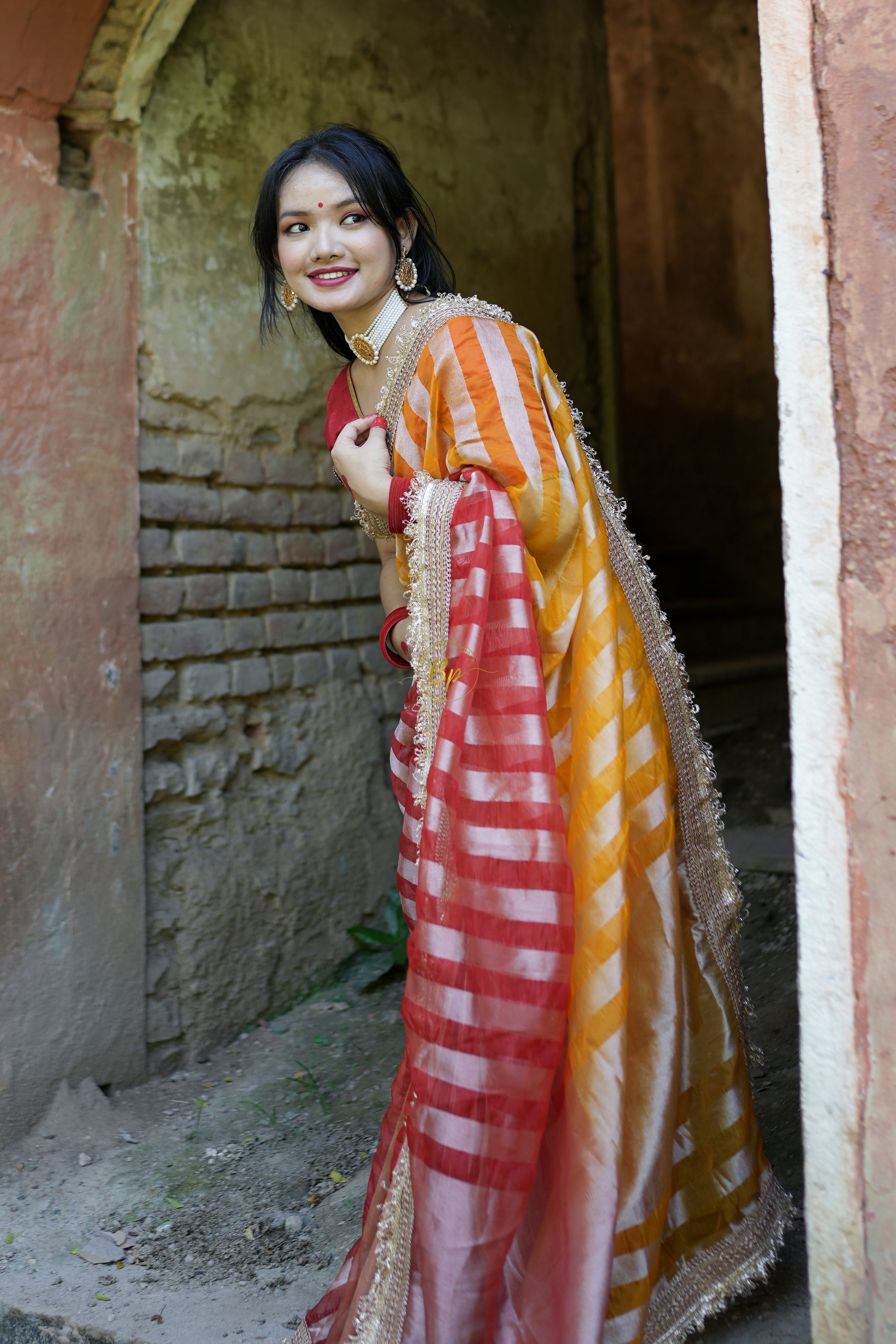 This plane tissue saree is available in red and yellow shades with silver zari design, border and pallu. It has beautiful gota patti.