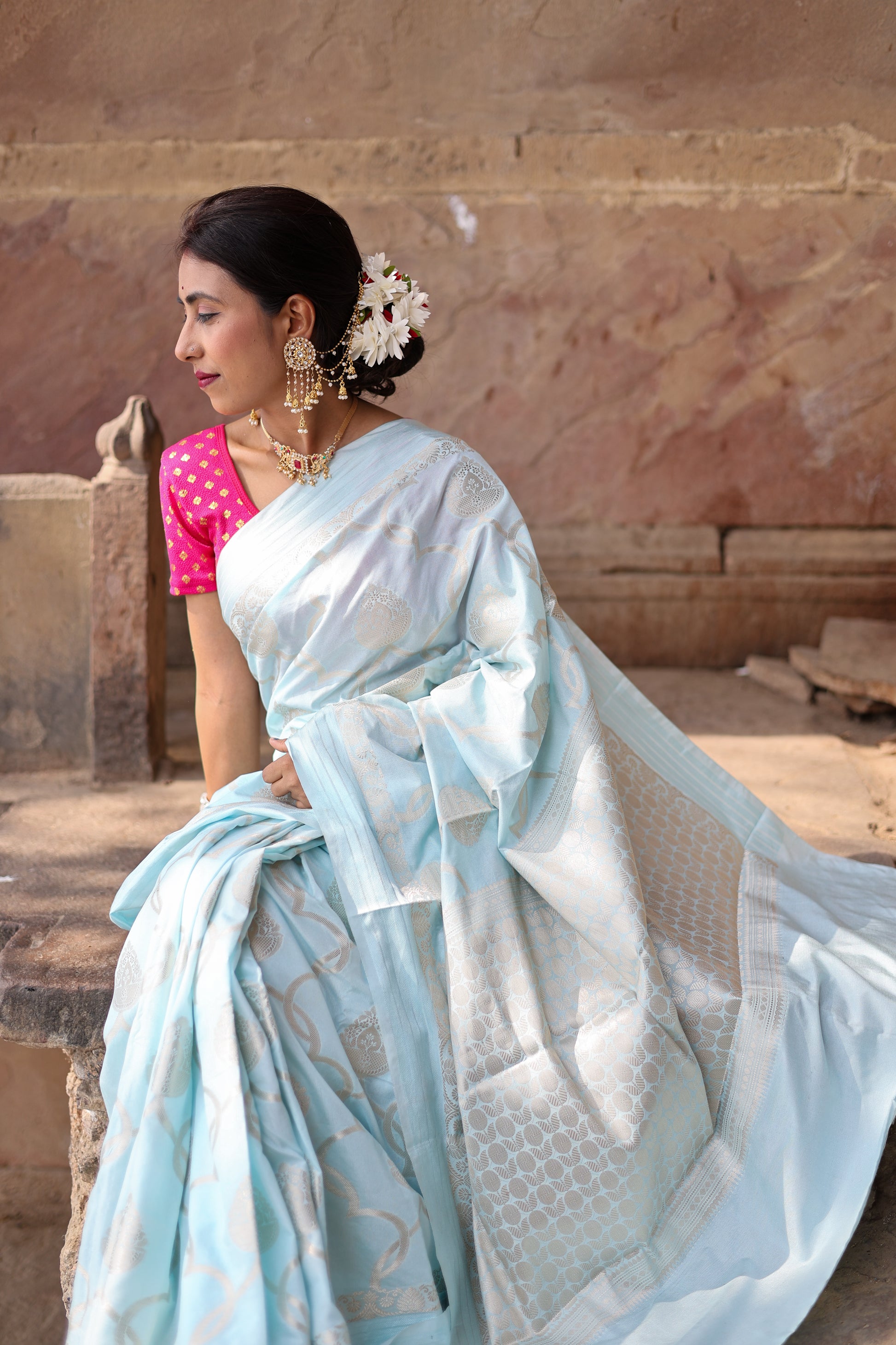 Hand woven banarasi powder blue banarasi silk saree with silver zari weaving